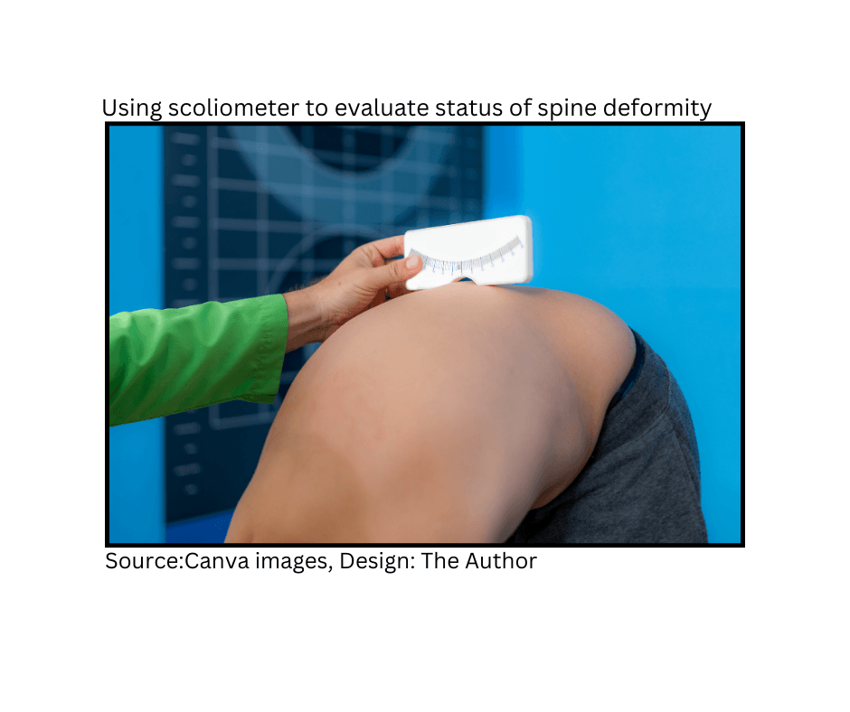 Scoliometer: One of the first thing, after visible evaluation, is measuring the angle with a scoliometer. Imagine it like measuring angles with a protractor back in geometry class. The provider uses a specialized instrument called a scoliometer. Placing this tool on your back, the scoliometer helps determine the curvature of your spine.